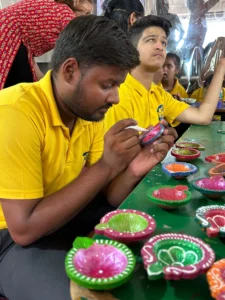 Students of Parivartan school beautifully paint earthen diya and earthen pot. This activity is done all year through.